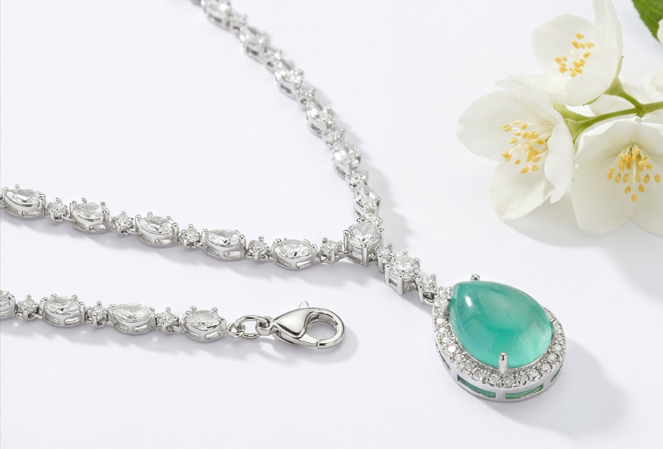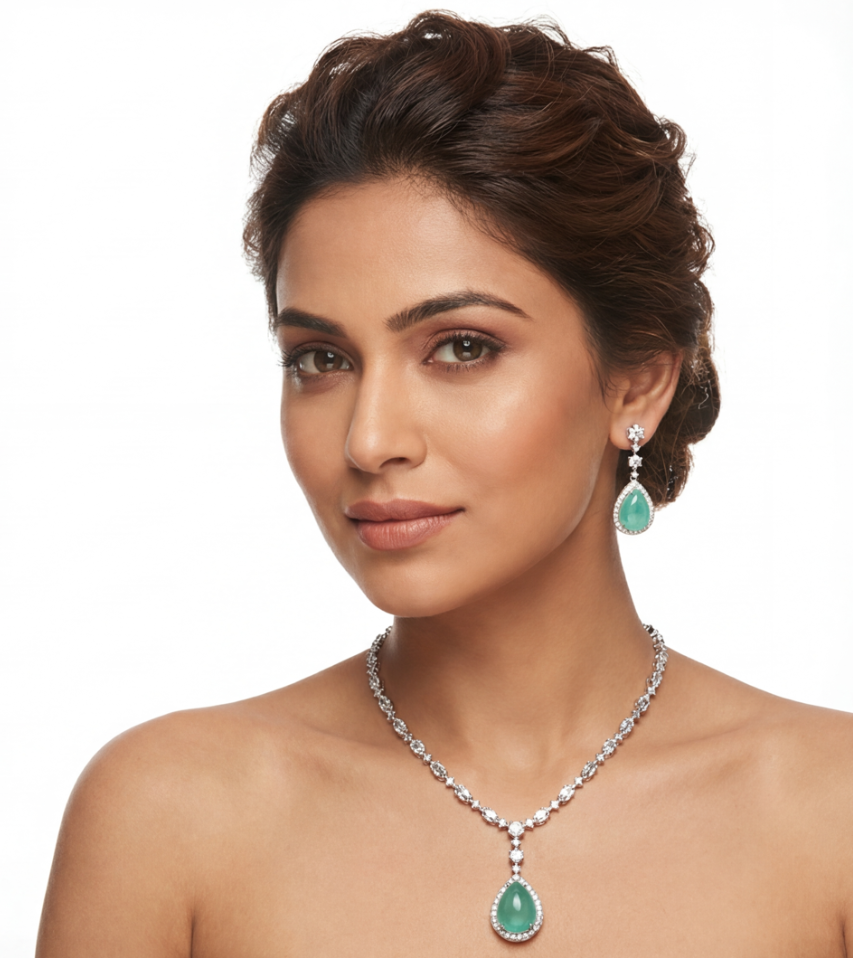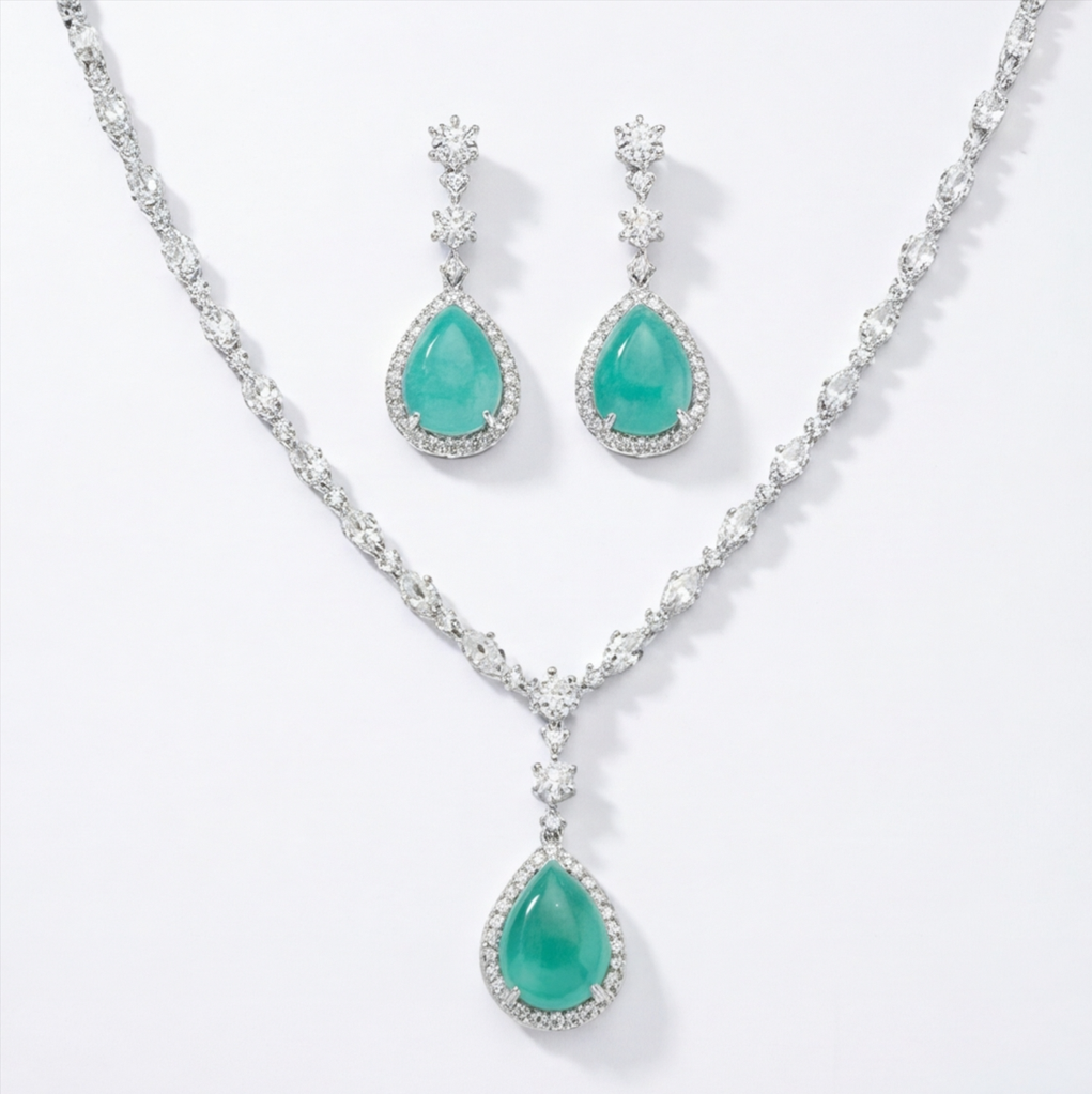 The fluid design mimics a cascading droplet of water, offering a look that is both organic and opulent. Perfectly paired with matching drop earrings, this set brings a bright, youthful radiance to any daytime event, garden party, or pastel ensemble.