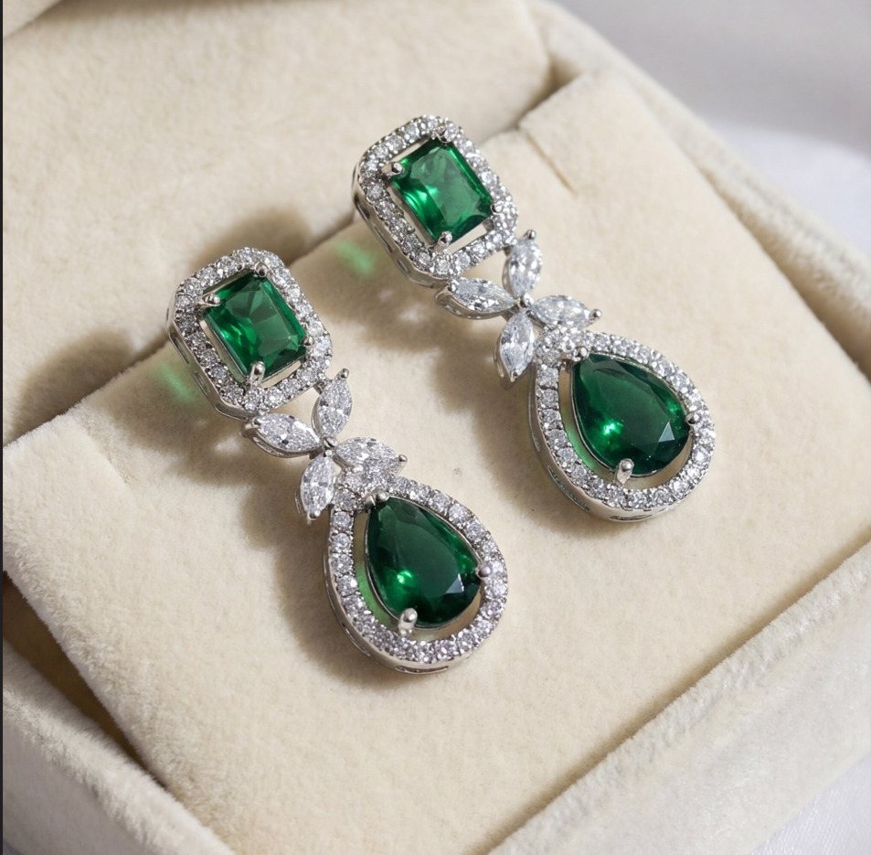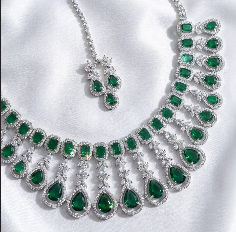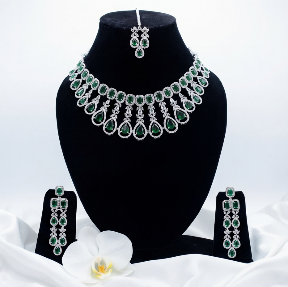 Designed for the modern queen, this set features a magnificent collar-style necklace adorned with deep emerald-green teardrops and geometric American Diamonds. The grandeur extends to the matching chandelier earrings and an exquisite Maang Tikka, ensuring a complete, head-to-toe royal look.