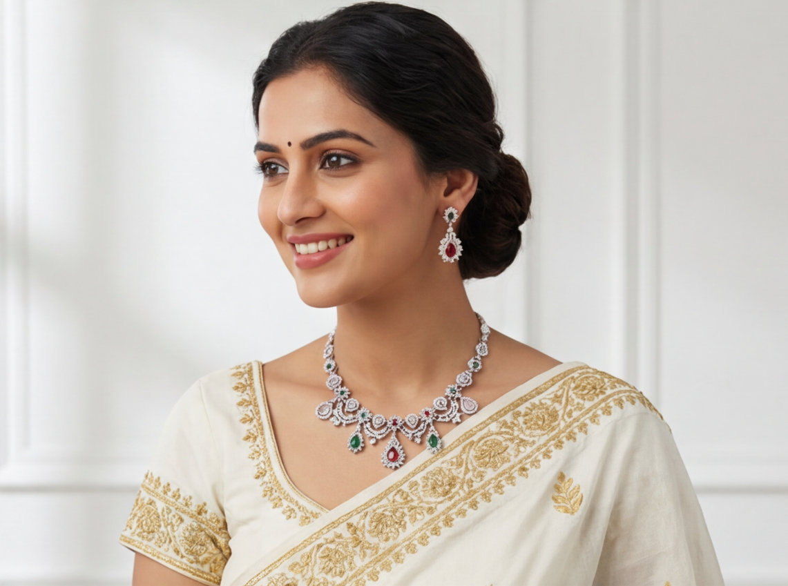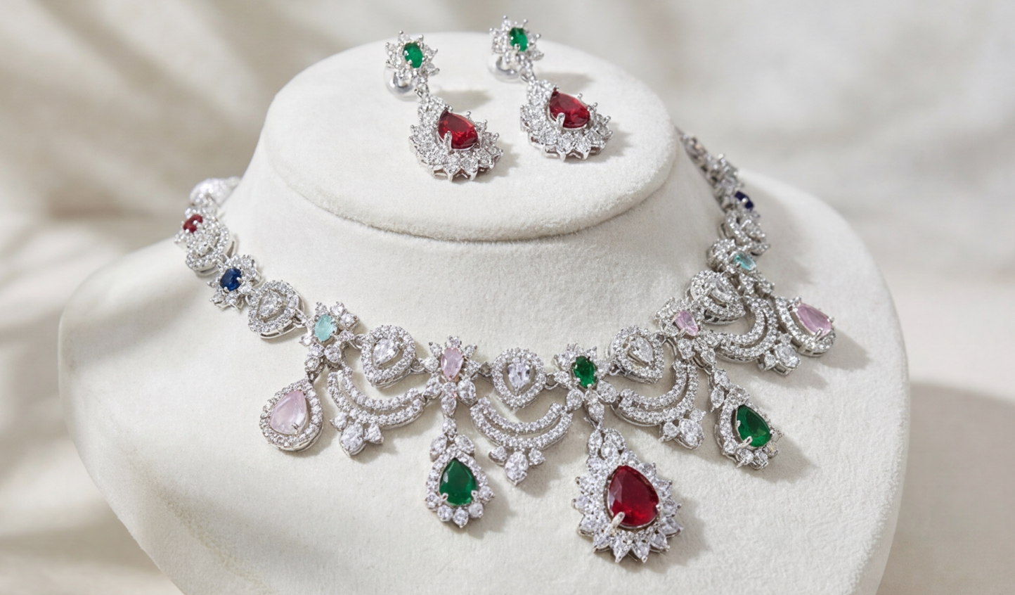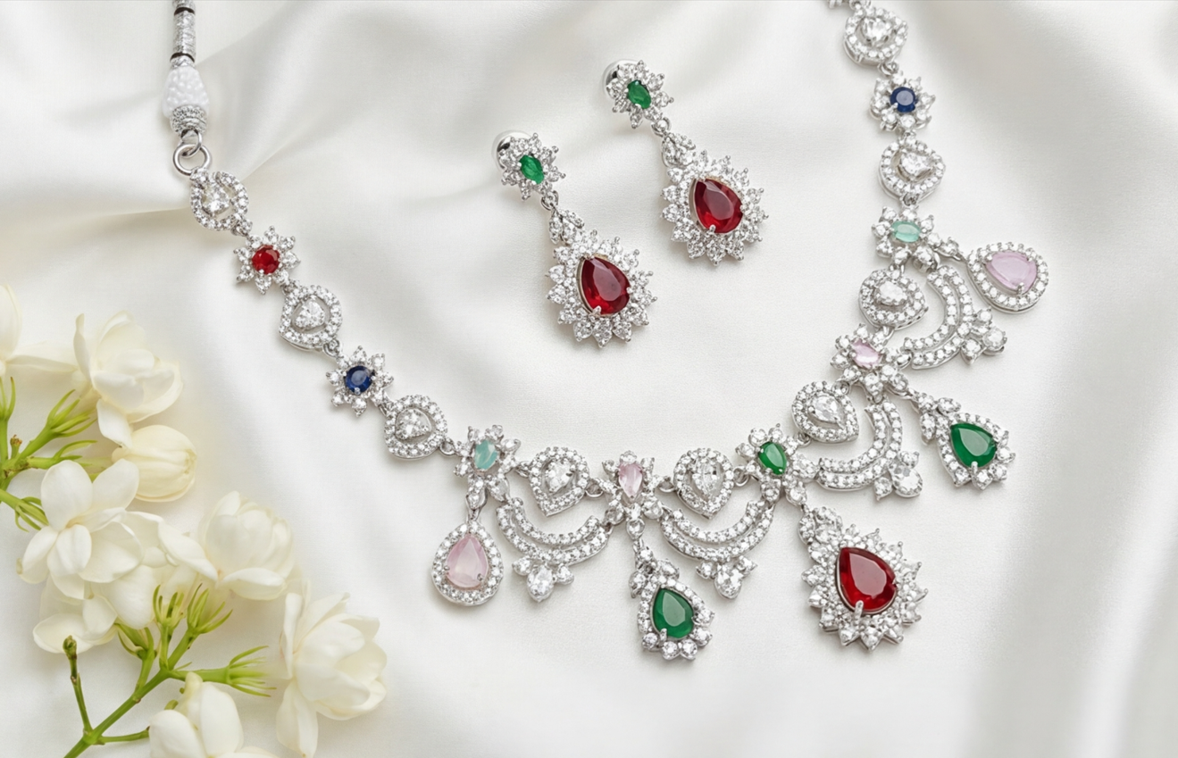 This exquisite necklace creates a harmonious mosaic of color, blending ruby red, emerald green, sapphire blue, and soft blush-pink simulants. Set within an intricate, scalloped framework of sparkling American Diamonds, the design mimics delicate lace.